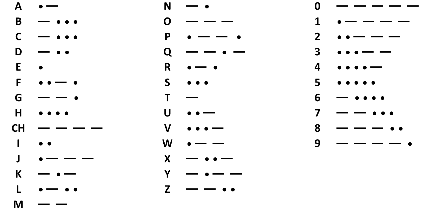 Standard international Morse code (A–Z, 0–9).